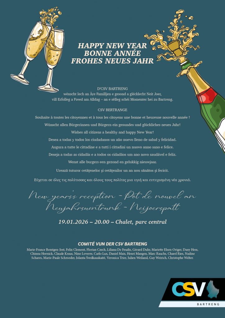 Neijorspatt – NEW YEARS’S RECEPTION – POT DE NOUVEL AN – NEUJAHRSUMTRUNK 5. January 2026 Neiegkeeten monday – lundi – Montag – Méindeg19.01.2026 – 20.00 – CHALET, Parc Central